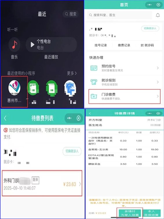绑定完成后,即可进入“惠州市第一妇幼保健院”公众号/小程序进行线上代办门诊费用医保结算。