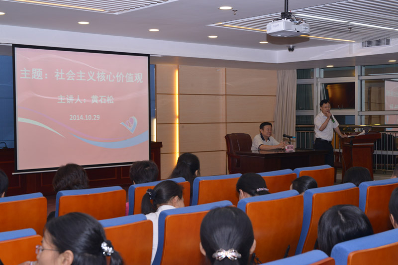 为推进我院“道德讲堂”建设活动持续深入开展,学习社会主义核心价值观,提升我院干部职工道德修养和社会文明程度。,我院在门诊部4楼报告厅举办“道德讲堂”与坚守社会主义核心价值观专题活动。活动特邀市委党校正处级干部黄石松同志作坚守社会主义核心价值观专题辅导报告。党委书记陈伟明、党委副书记陈付社及全体干部职工共计约450余人参加了专题活动。