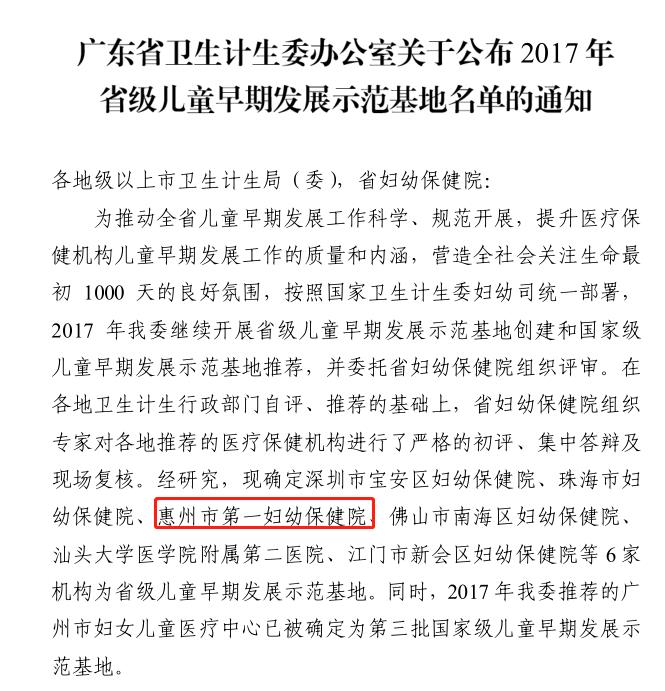 近日,广东省卫生计生委公布了2017年省级儿童早期发展示范基地名单,我院名列其中!此次全省共6家医疗机构获此殊荣,这标志着我院的儿童早期发展服务能力及技术水平已达到省级示范标准,是我市广大妇女儿童健康的有力保障。
