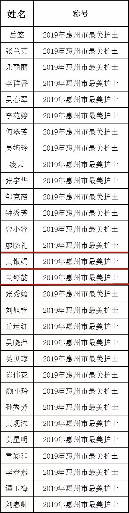 在“5•12”国际护士节来临前夕,为形成尊医重护良好氛围,树立行业先进典型,惠州市护理学会、惠州报业传媒集团携手开展了“2019寻找惠州最美护士”评选活动。经过网络投票和专家评分,最终评选出了30名“2019年惠州市最美护士”和35名“2019年护理岗位贡献奖”。其中,惠州市妇幼保健计划生育服务中心黄银娟、廖晓礼、黄舒韵获评“2019年惠州市最美护士”称号,邓菁获评“2019年护理岗位贡献奖”。