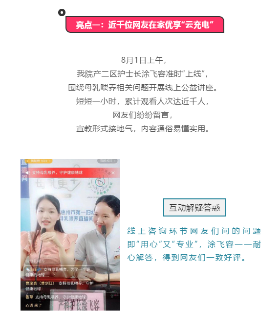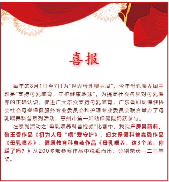 作为爱婴医院,我院一直致力全面推广母乳喂养理念,开展促进母乳喂养相关工作。今年母乳喂养周期间,我院除了组织各科室自制科普视频,还通过开展线上直播、做客电台等形式,推送传播母乳喂养知识和技能。