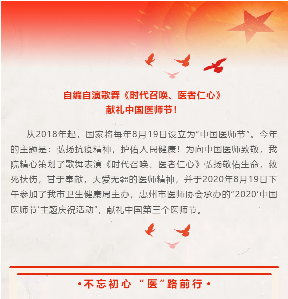 由我院自编自导的歌舞《时代召唤、医者仁心》,讲述的是一名医务工作者成长为共产党员的励志故事,歌舞中蕴藏了医疗行业中无数感人的瞬间,彰显了妇幼人饱满热情的自信风采;诠释了一名共产党员坚定不移的理想信念,对党忠诚,时刻守护着人民健康!