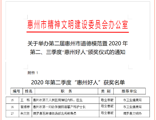 12月3日,在由惠州市精神文明建设委员会指导,中共惠州市委宣传部、惠州市精神文明建设委员会办公室主办,羊城晚报报业集团承办的“好人就在身边”——第二届惠州市道德模范暨2020年第二、三季度“惠州好人”颁奖仪式上,市第一妇幼保健院温馨产科护士长崔嫦婷被授予2020 年第二季度“惠州好人”荣誉称号。