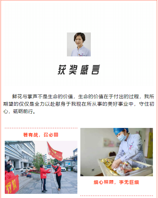 抗疫前线她带头担当,勇敢承担起预检分诊重任,进舱首日便在5个小时内完成了3辆车共50多名患者的收治工作。身为医疗队院感督察员,严格认真地对每个进入疫区的医护人员进行全面的防护检查,确保所有操作步骤都符合院感要求,从而杜绝院内感染,有效保障医务人员的生命安全。入舱17天,她共完成院感观察130人次,所在广东医疗队护理团队共收治患者106名,治愈出舱77人,实现了患者零死亡、医护人员零感染。