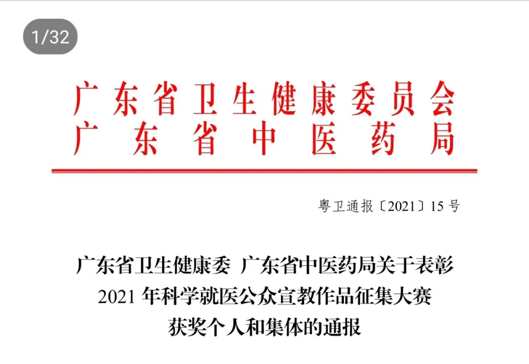 在广东省卫生健康委、广东省中医药局举办的2021年科学就医公众宣教作品征集大赛中,我院作品《门急诊美小护的温馨提示》荣获科学就医视频类二等奖。