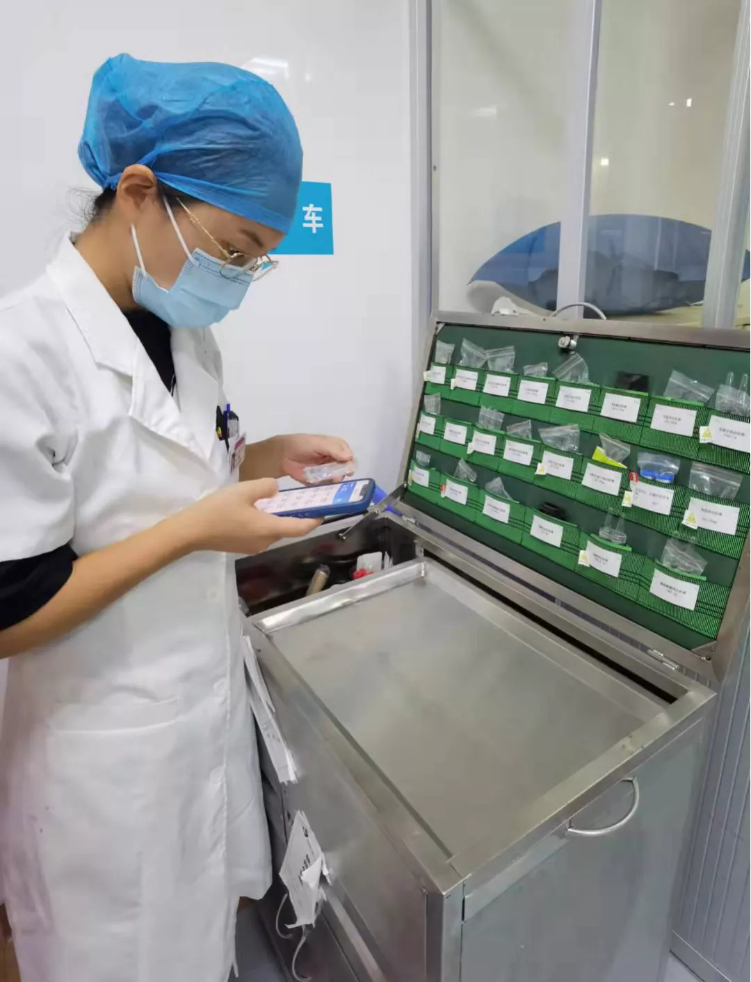 药师利用查检软件检查急救车药品。