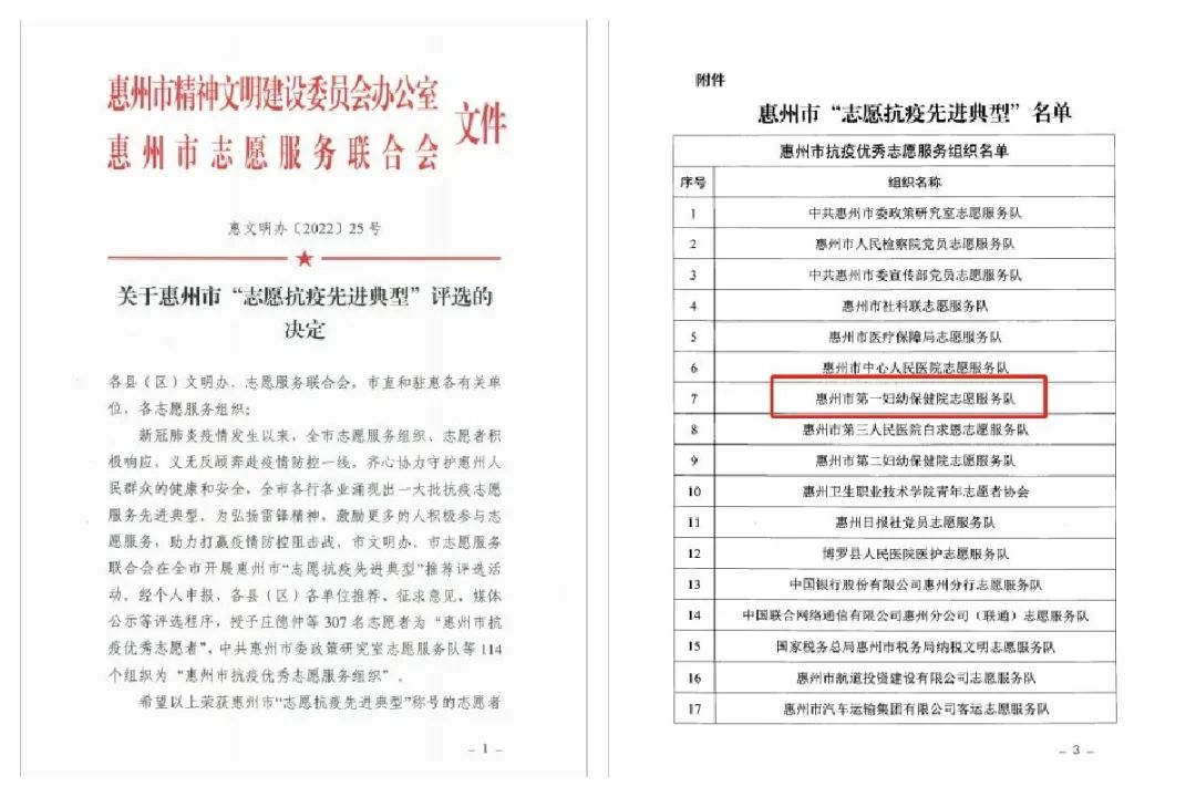 喜讯 | 惠州市第一妇幼保健院志愿服务队获评“惠州市抗疫优秀志愿服务组织”