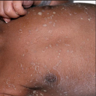 病变在子宫内开始为脓疱,然后破裂,留下鳞屑和色素沉着斑,宝宝出生时会同时出现脓疱、鳞屑、和色素沉着斑。全身皮肤均可受累,最常见于下颌、前额、颈部、下背部、臀部等。