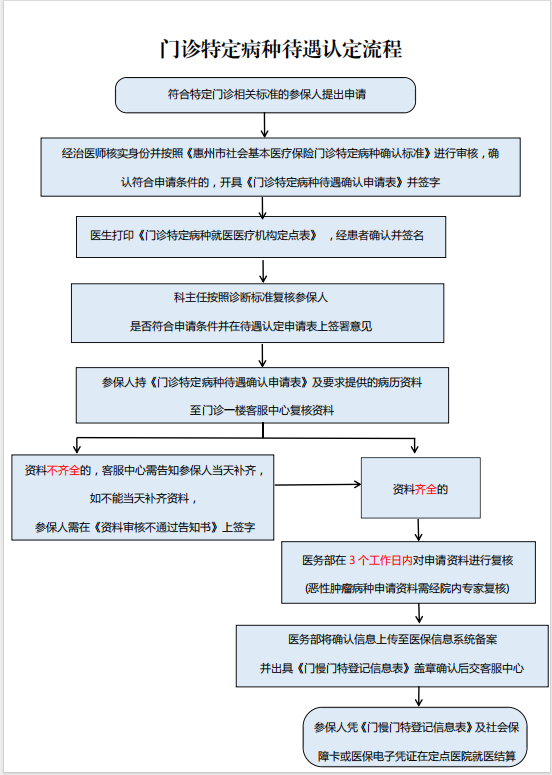 本院目前有待遇认定资格的病种包括:恶性肿瘤(化疗、内分泌治疗、免疫治疗、生物治疗)、恶性肿瘤(非放、化疗治疗)儿童白血病、地中海贫血、癫痫、支气管哮喘、血友病、高血压、糖尿病、慢性心功能不全等,共10个病种。经相关专业执业资质的接诊医师诊断,判断参保人员病情符合相应门特病种准入标准的,指导患者备齐相关资料(详见附件2),可为其申请门特待遇,流程详见下图:
