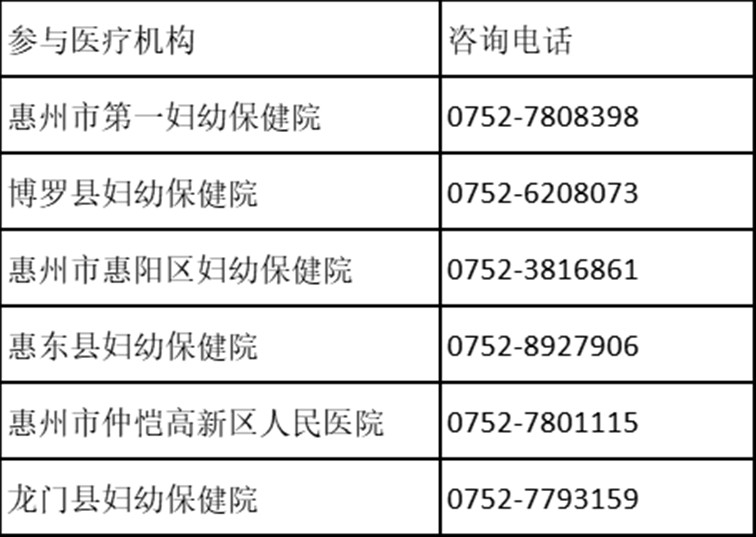 详情请咨询惠州市第一妇幼保健院及相关参与医疗机构: