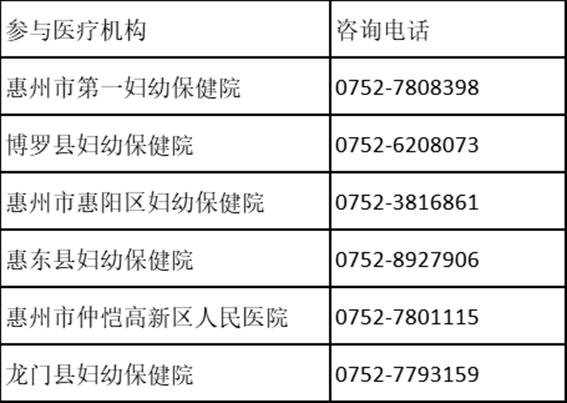 详情请咨询惠州市第一妇幼保健院及相关参与医疗机构: